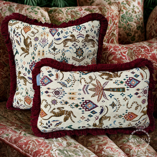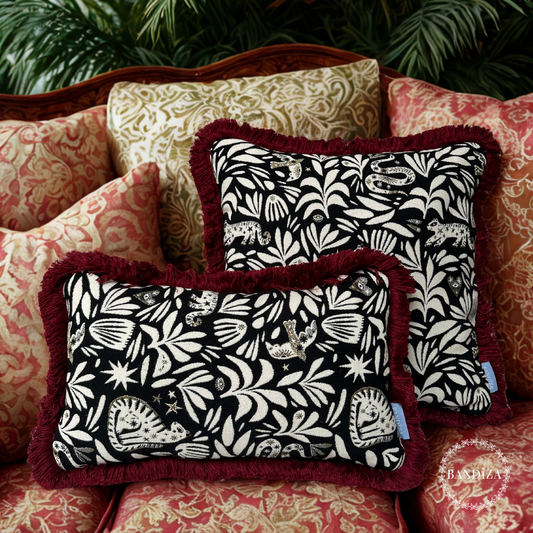 Kussen Selva boho - 50x30 cm – Jacquard met botanisch design en rode franjerand